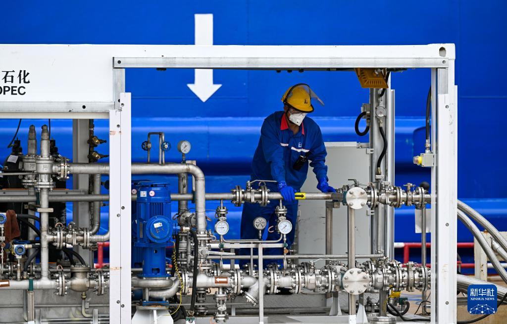 9月22日,在天津港環(huán)球滾裝碼頭,工作人員在加注前檢查設(shè)備。