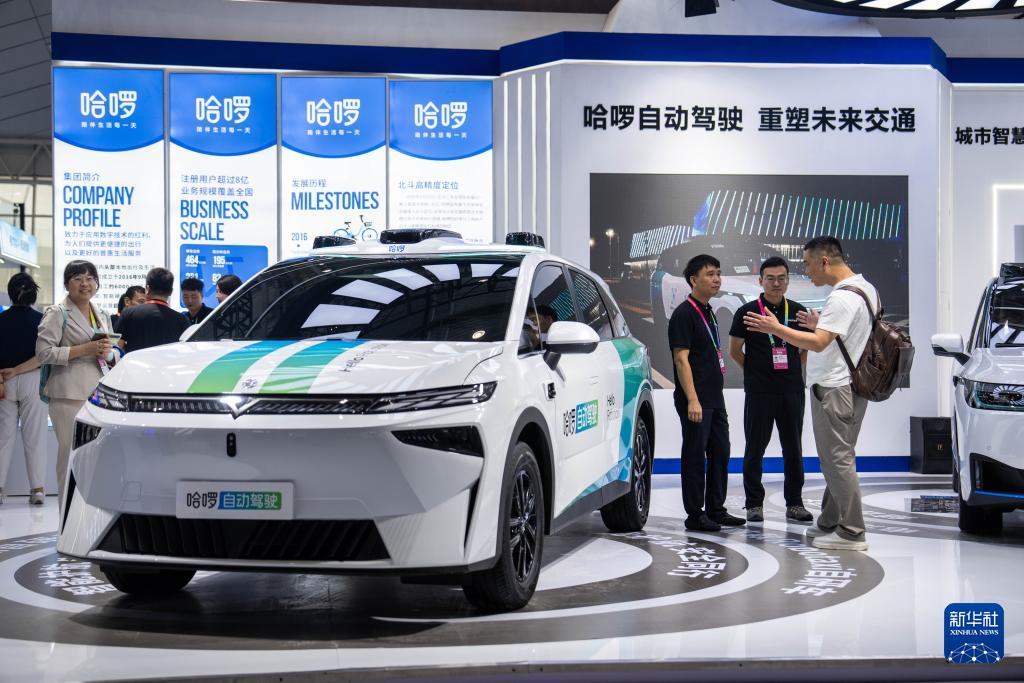 9月24日,在株洲國際會(huì)展中心,觀眾(右一)在了解一臺(tái)配有北斗技術(shù)的自動(dòng)駕駛汽車。