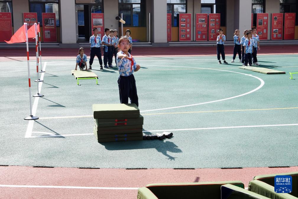 9月24日,北京市第二十中學附屬育鷹小學學生在國防教育基礎課《偵察兵大比武——投擲與游戲》上投擲。