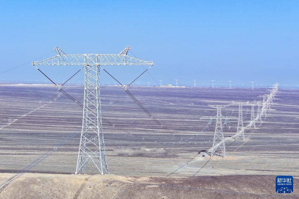 在新疆昌吉回族自治州木壘哈薩克自治縣拍攝的±1100千伏昌吉-古泉特高壓直流輸電線路(7月5日攝)。