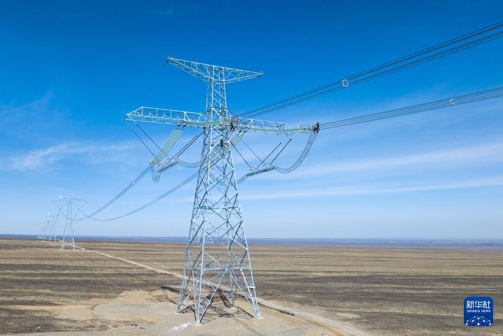 矗立在戈壁上的±800千伏哈密—重慶特高壓直流輸電線路工程(4月8日攝,無人機(jī)照片)。