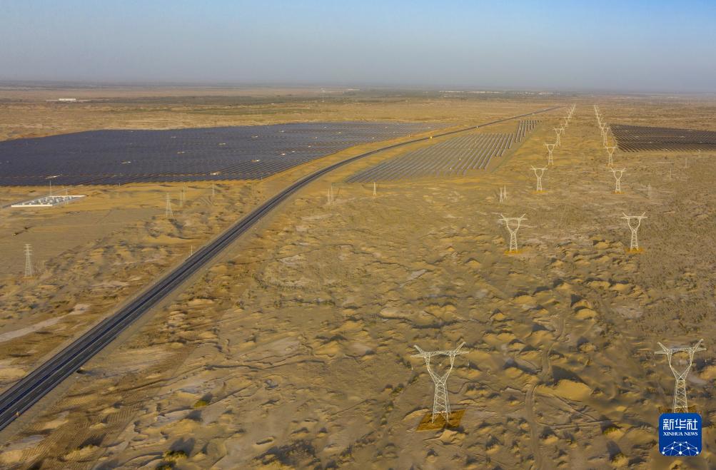 9月22日在新疆巴音郭楞蒙古自治州境內(nèi)的烏若高速附近拍攝的光伏電站和輸電線(無人機(jī)照片)。