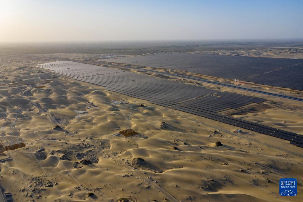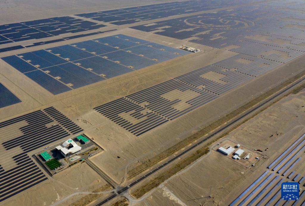 9月22日在新疆巴音郭楞蒙古自治州若羌縣拍攝的中國綠發(fā)新疆中綠電若羌400萬千瓦光伏項(xiàng)目(無人機(jī)照片)。該項(xiàng)目每年可發(fā)電69.08億千瓦時(shí),滿足南疆200萬戶家庭用電需求。