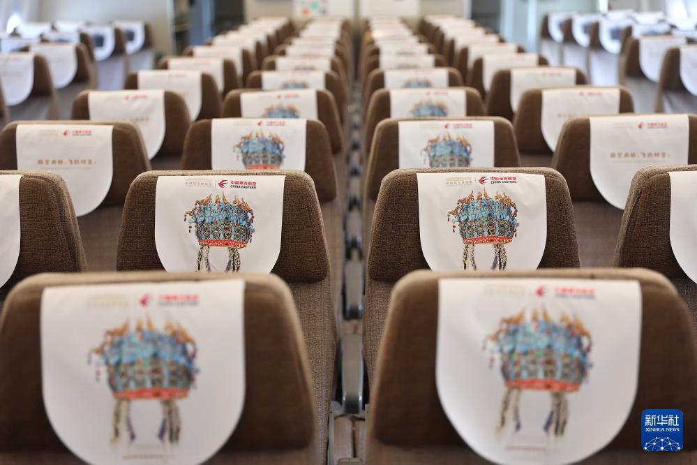 9月28日拍攝的“國(guó)博號(hào)”彩繪主題飛機(jī)上鳳冠圖案的頭枕巾。