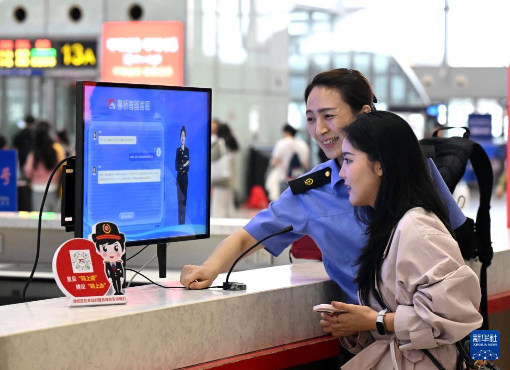 10月5日,在河北石家莊火車站候車大廳服務(wù)臺,旅客向“AI智能客服機”問詢旅行信息。