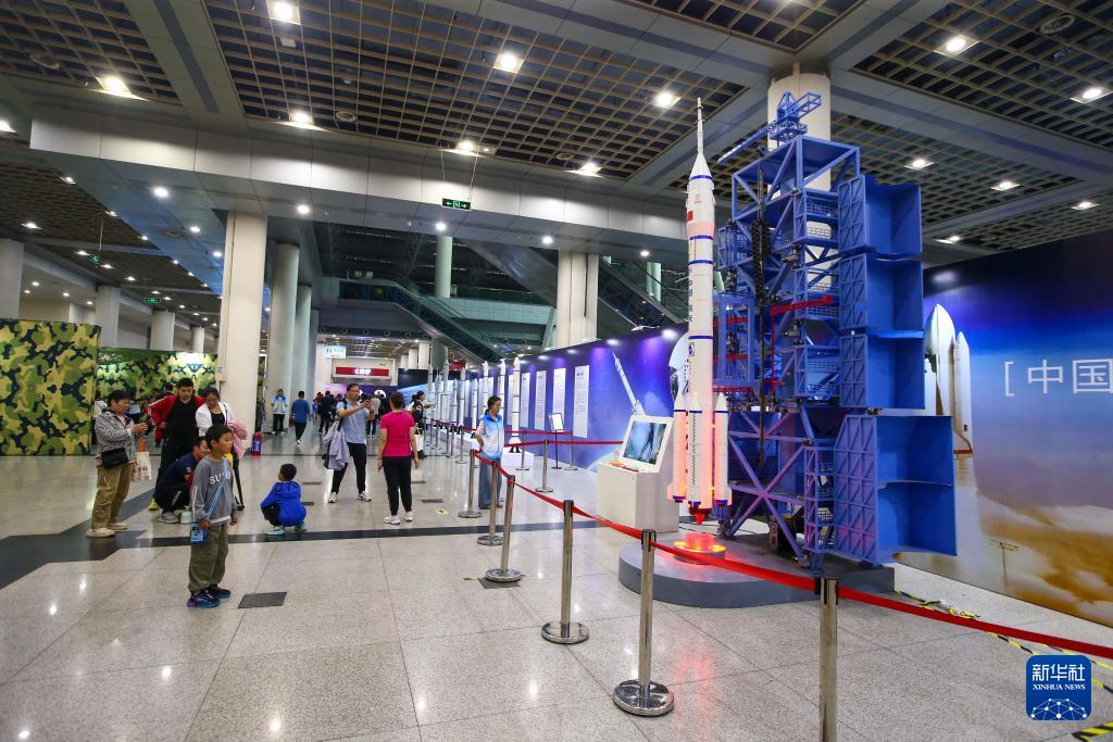 10月3日,在山東濟南市舜耕國際會展中心,市民在參觀航空航天科普展。