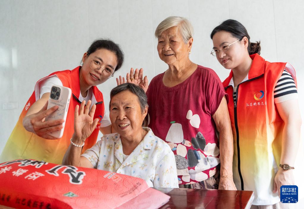 10月5日,江蘇省南通市通州區(qū)金新街道界北村志愿者幫助老人與遠在海外的子女進行視頻通話,“云端”相聚,共迎中秋。