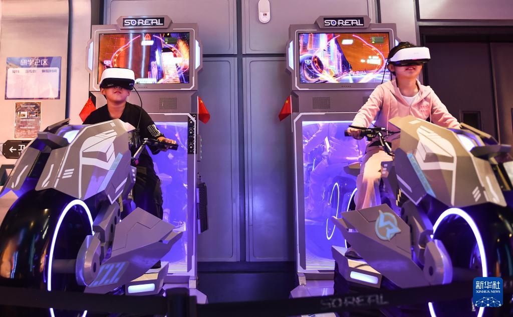10月4日,在河南省洛陽市澗西區(qū)未來城科幻樂園內(nèi),孩子們在體驗VR虛擬技術(shù)沉浸式場景。