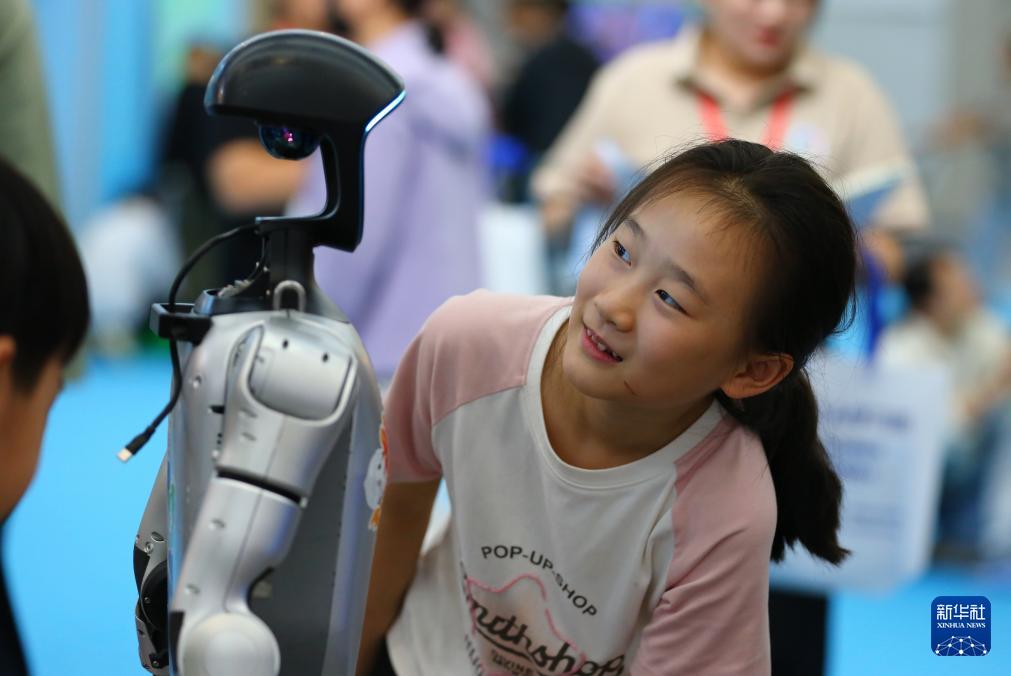 10月2日,在山東省第九屆滕州書展現(xiàn)場,小朋友與機器人互動。
