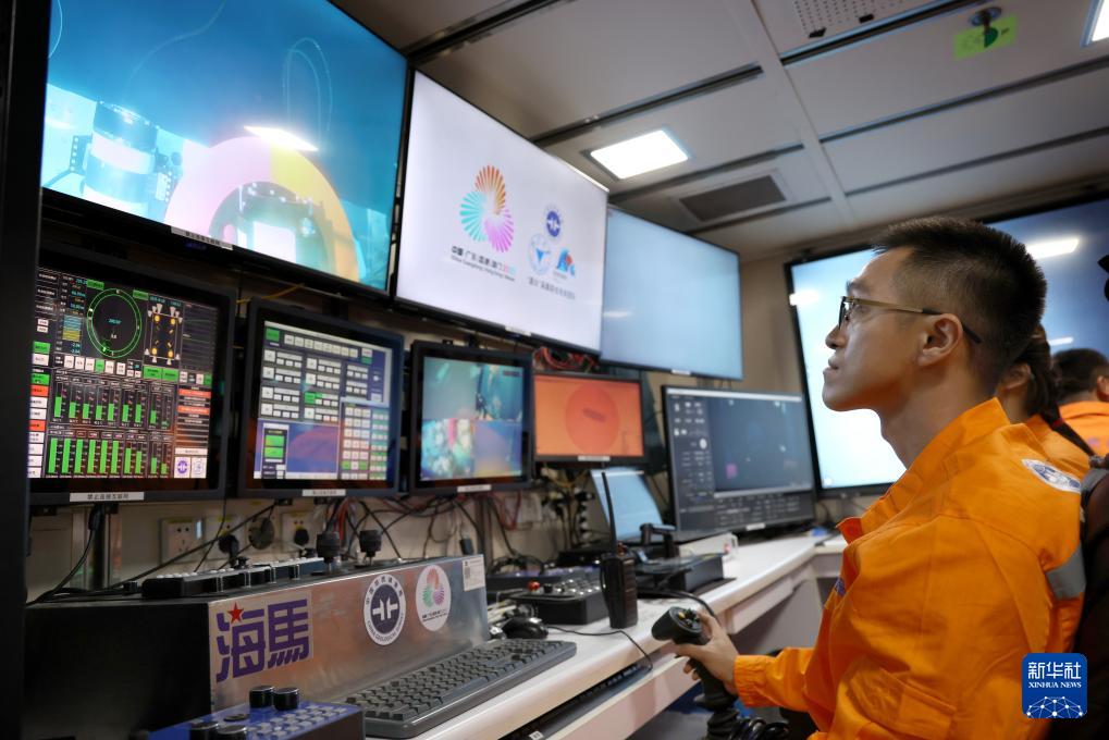 在科考船上的“海馬”號深海遙控潛水器控制室里,工作人員遙控采火裝置在海底進行作業(yè)(9月18日攝)。