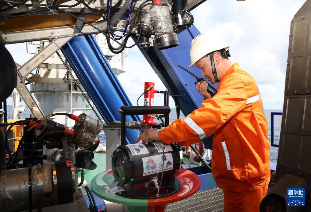 “海馬”號深海遙控潛水器搭載著采火裝置準(zhǔn)備下水采集“源火”(9月18日攝)。