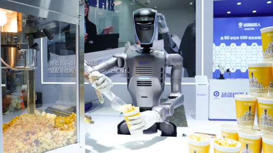 在“接打爆米花”時,DOBOT AtomⅡ展現(xiàn)出了靈活上下肢協(xié)同控制能力與瞬時反應(yīng)速度,除了能夠在狹窄的操作臺之間靈活轉(zhuǎn)身,平穩(wěn)精準地將爆米花倒入盒中遞給觀眾,還能快速回應(yīng)觀眾揮手、比心、鼓掌等互動需求。