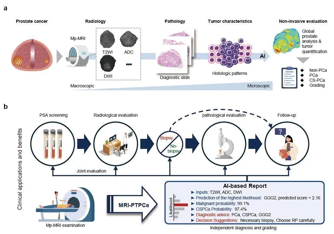 前列腺癌是男性高發(fā)且致死率高的癌癥。當前臨床缺乏術前精準預測腫瘤侵襲性的工具,易出現過度診斷或漏診。人工智能(AI)技術的發(fā)展,為通過影像學與病理學關聯實現無創(chuàng)精準診療提供了新路徑。