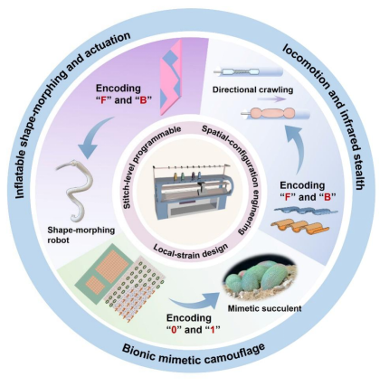 該團隊基于這一原理,研制出具備可調(diào)剛度與彈性的柔性針織機器人,能夠完成復(fù)雜曲面變形,并展示了可多模式變形機器人、流體驅(qū)動的紅外隱身柔性爬行機器人,以及仿生擬態(tài)偽裝系統(tǒng)等多種應(yīng)用原型。