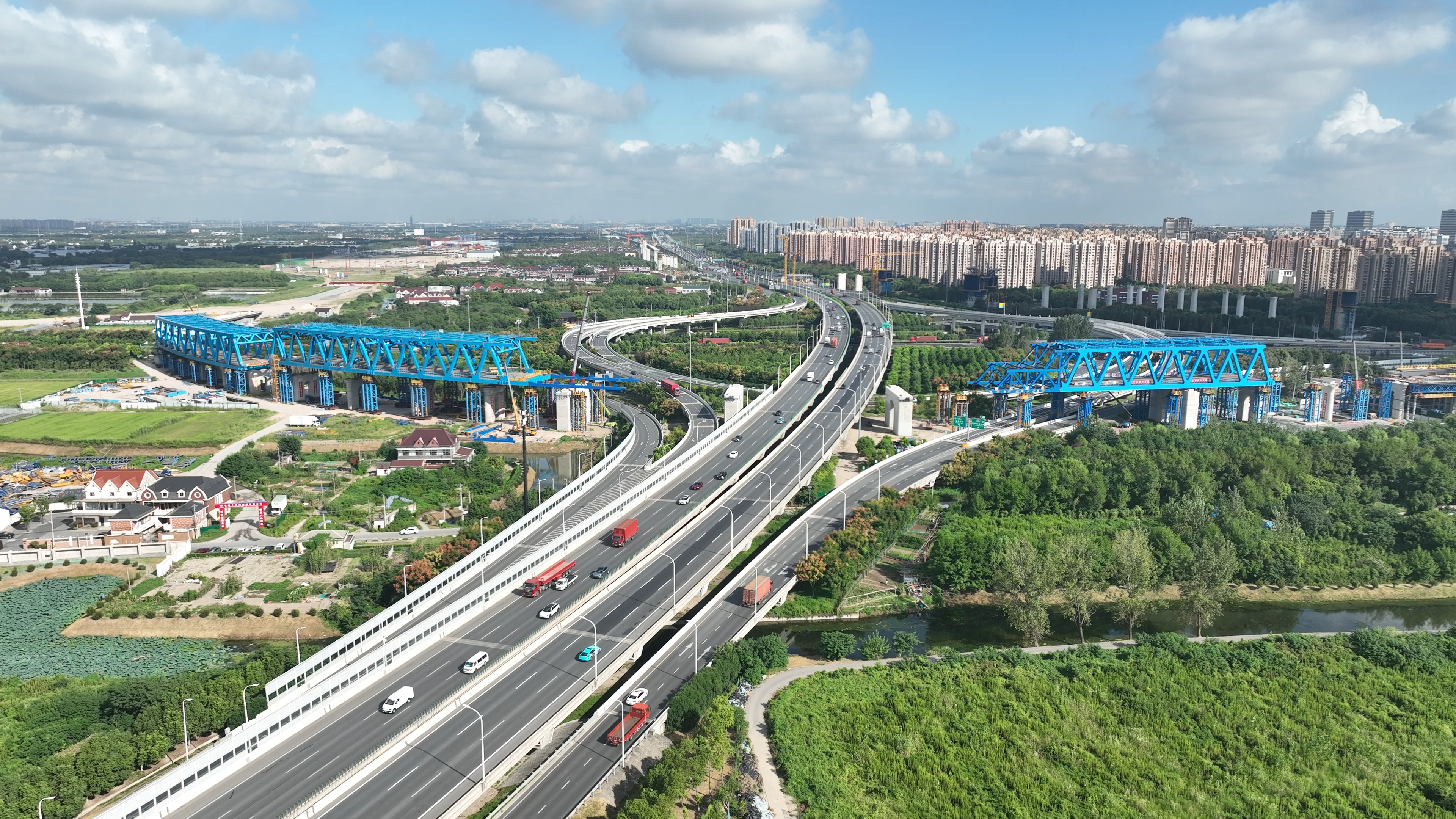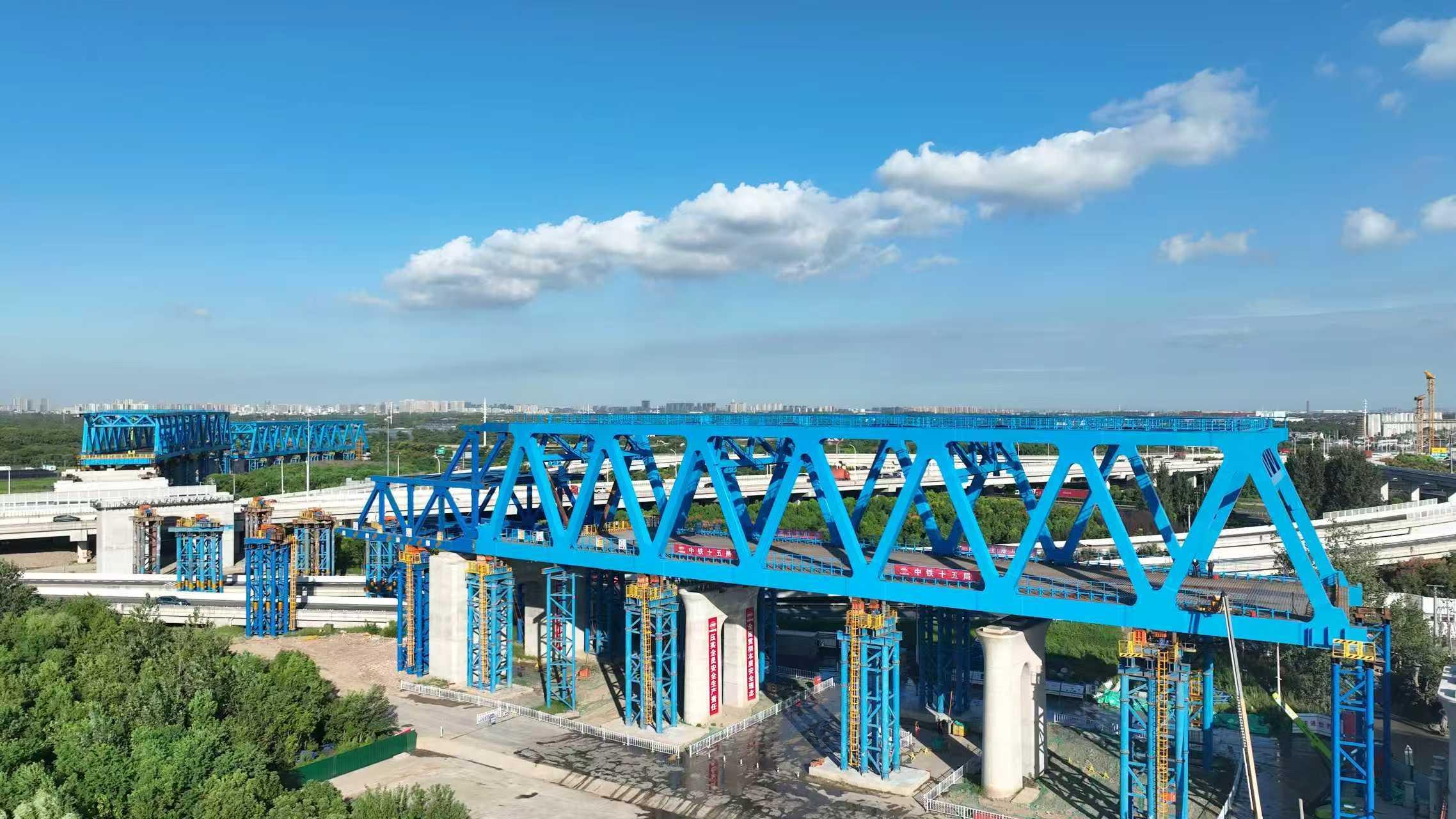 項目承建的滬渝蓉動走三線鋼桁梁工程主要包含一處228米曲線連續(xù)鋼桁梁以及一處120米曲線簡支鋼桁梁,兩處結(jié)構(gòu)位于405米的圓曲線上,分別需上跨S7滬崇高速以及G1503上海繞城高速,該段設(shè)計時速80千米,鋼桁梁總重量約8815噸,因橋位現(xiàn)場環(huán)境復雜、曲線頂推精度要求高、糾偏難度大,是標段重點、難點控制性工程。