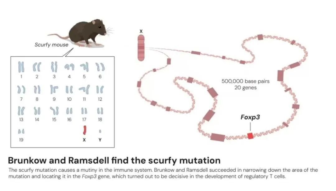 因此,他們決定尋找壞血病小鼠的突變基因。不過,這在20世紀(jì)90年代就像大海撈針一樣極為困難,因?yàn)樾∈笾蠿染色體的DNA是由約1.7億個(gè)堿基配對(duì)核苷酸組成。經(jīng)過大量的艱苦研究和基因檢測,最后他們找到了導(dǎo)致壞血病的基因Foxp3基因。這個(gè)基因不只是以前未知的,而且與一組稱為叉頭盒(FOX)的基因有許多相似之處。這些基因調(diào)節(jié)其他基因的活性,從而影響細(xì)胞發(fā)育。