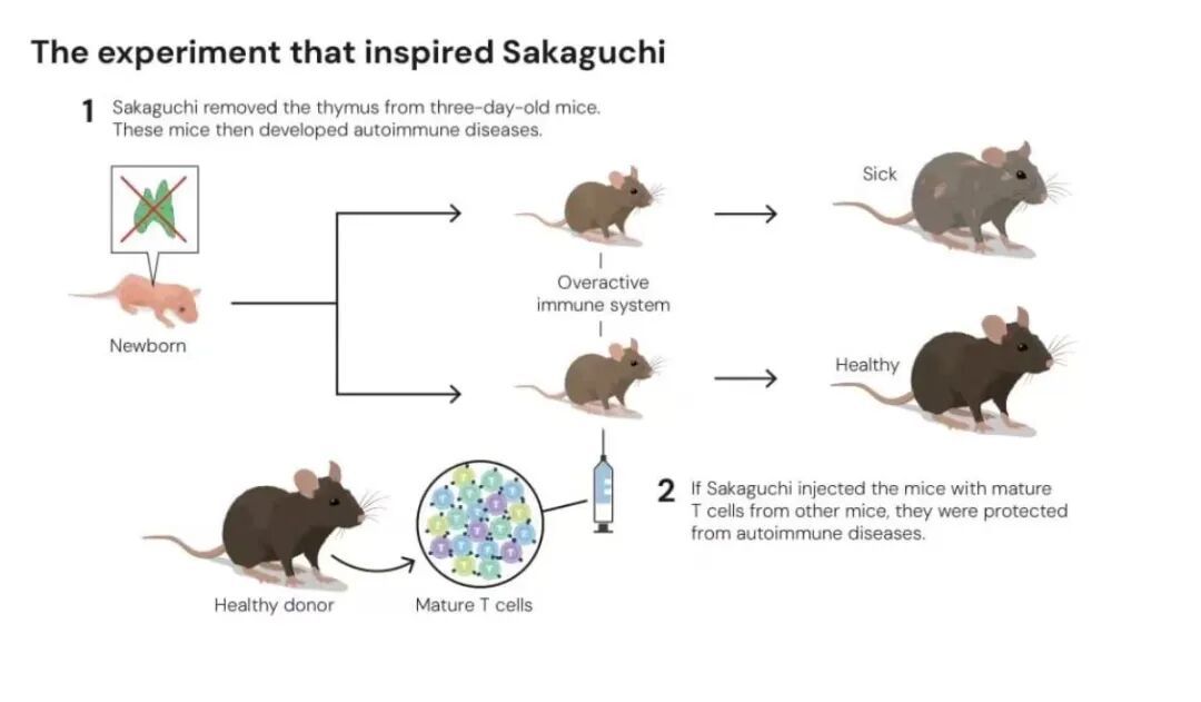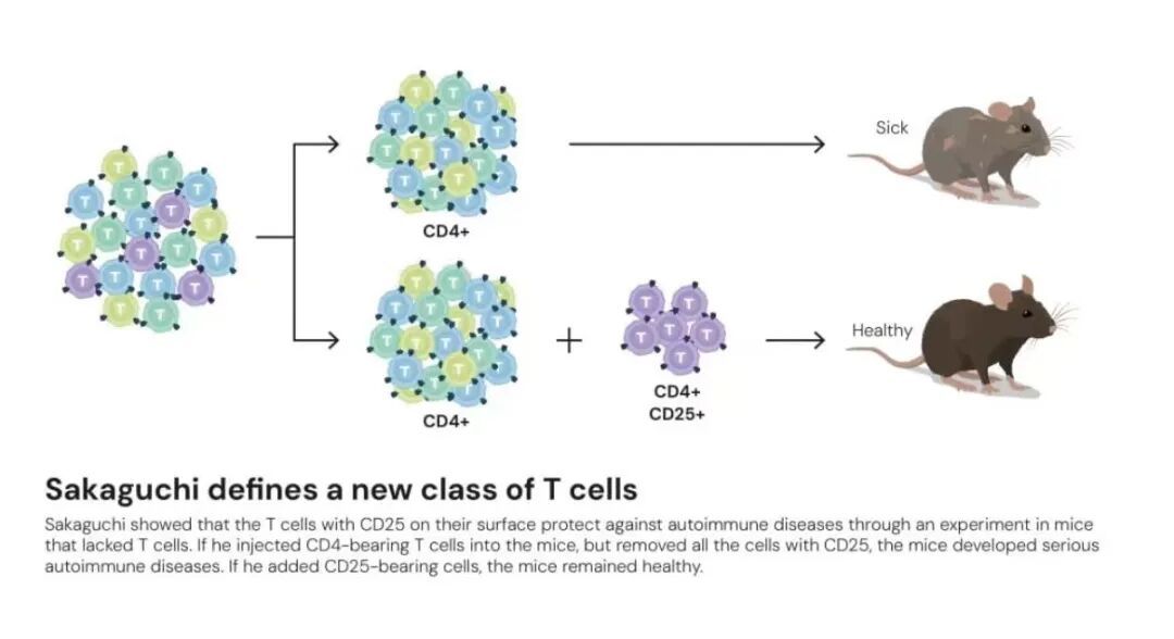 日本名古屋的愛知縣癌癥中心研究所的坂口志文于1995年在《免疫學(xué)雜志》上首先發(fā)表研究結(jié)果,宣稱發(fā)現(xiàn)了一類全新的T細(xì)胞,其特征在于其表面攜帶CD4受體,同時(shí)還攜帶一種稱為CD25的受體(蛋白質(zhì))。坂口志文設(shè)計(jì)了一個(gè)對(duì)小鼠的精巧的實(shí)驗(yàn),證明小鼠的表面帶有CD4和CD25兩種蛋白的T細(xì)胞是控制自身免疫反應(yīng)的“開關(guān)”。把健康小鼠體內(nèi)的這些細(xì)胞移除后,小鼠患上了嚴(yán)重的自身免疫病;反之,把這些細(xì)胞輸回病鼠體內(nèi),則阻止了疾病。