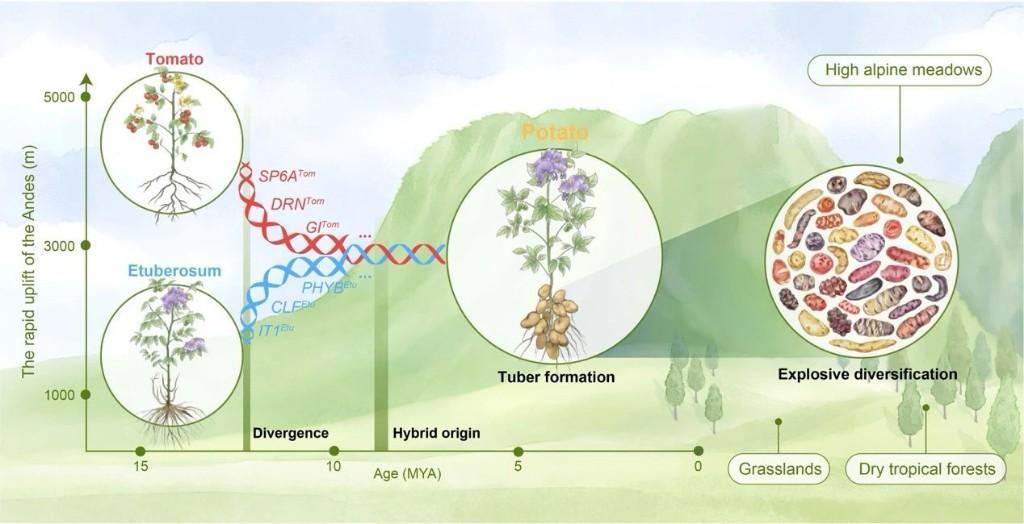 7月31日,中國農(nóng)業(yè)科學(xué)院深圳農(nóng)業(yè)基因組研究所(嶺南現(xiàn)代農(nóng)業(yè)科學(xué)與技術(shù)廣東省實(shí)驗(yàn)室深圳分中心)黃三文團(tuán)隊(duì)聯(lián)合國內(nèi)外研究機(jī)構(gòu)首次揭示了茄屬馬鈴薯組(Solanum section Petota)的雜交起源、薯塊形成和輻射分化。該研究是“優(yōu)薯計(jì)劃”的又一重大突破,為馬鈴薯育種改良提供了全新的理論視角。相關(guān)研究成果發(fā)表在《細(xì)胞(Cell)》上。