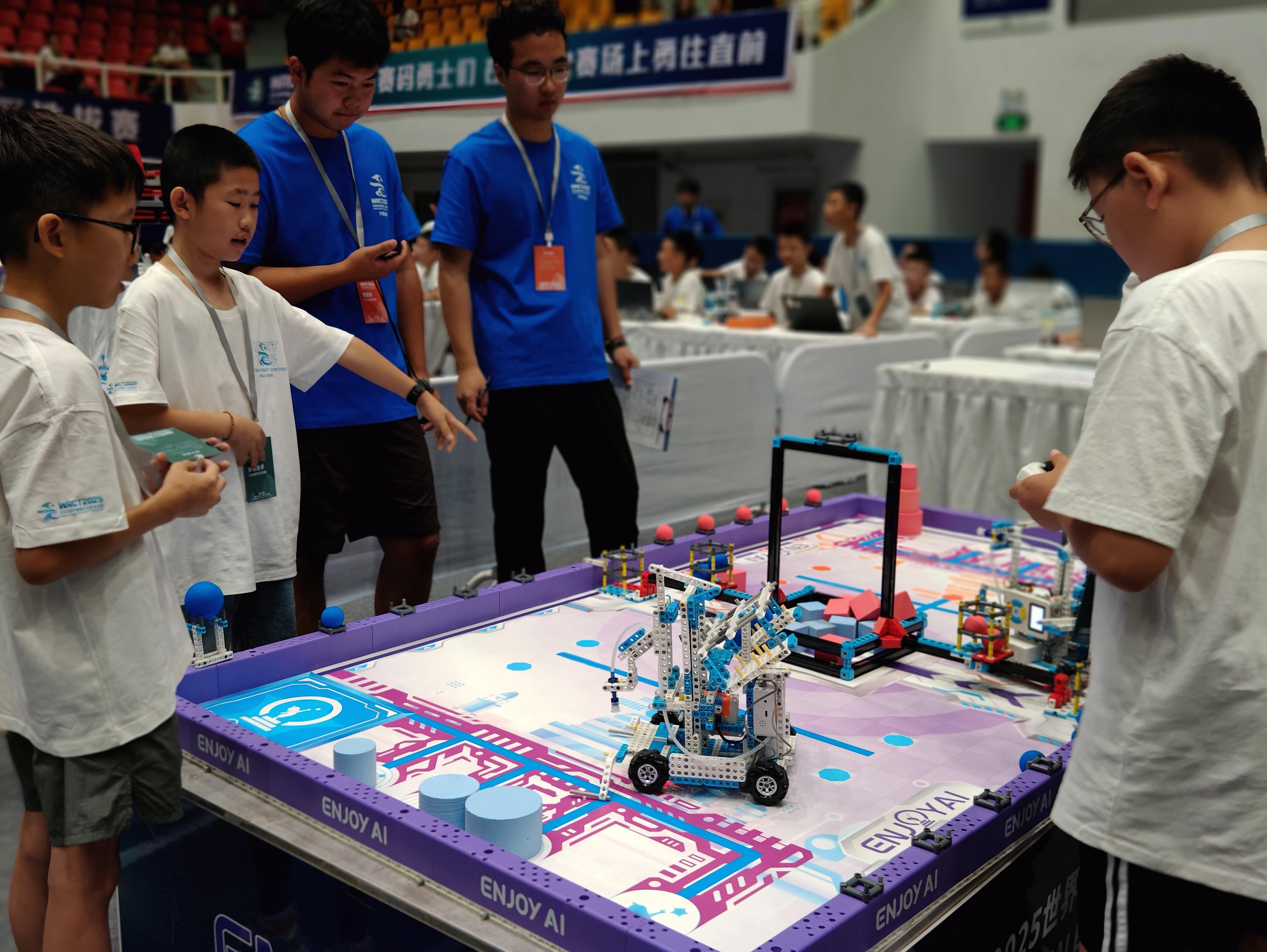 步入現(xiàn)場,參賽小選手或緊盯電腦屏幕,飛速敲擊鍵盤調(diào)整程序;或通過手柄遠(yuǎn)程操控機(jī)器人完成搬運(yùn)、對(duì)抗等復(fù)雜任務(wù);或俯身擰緊螺絲、檢查線路,不放過任何一個(gè)細(xì)節(jié)。團(tuán)隊(duì)成員默契配合、緊密協(xié)作,爭取在有限時(shí)間內(nèi)取得佳績。本次比賽設(shè)有MakeX數(shù)智先鋒、WHALESBOT文明啟航、Super AI筑夢星空、MeuroMaster腦機(jī)星球等14個(gè)賽項(xiàng),覆蓋從小學(xué)到高中不同年齡段。內(nèi)容緊密結(jié)合人工智能、機(jī)器人技術(shù)的前沿發(fā)展,注重考查選手創(chuàng)新設(shè)計(jì)、編程控制、機(jī)械結(jié)構(gòu)搭建和臨場解決問題的能力。