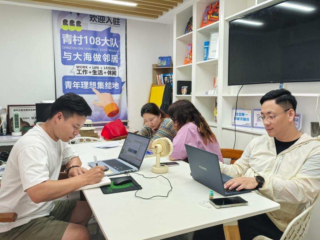 2025年6月25日,在浙江省溫州市洞頭區(qū)東屏街道東岙村,一群創(chuàng)業(yè)青年在“青村108大隊”海創(chuàng)空間內工作。新華社記者 王俊祿 攝