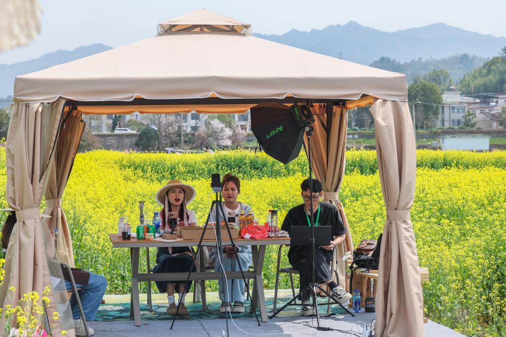 2025年3月23日,主播在浙江省建德市更樓街道城南城市田園油菜花田邊的直播間內推介當?shù)匚穆庙椖?。新華社記者 徐昱 攝