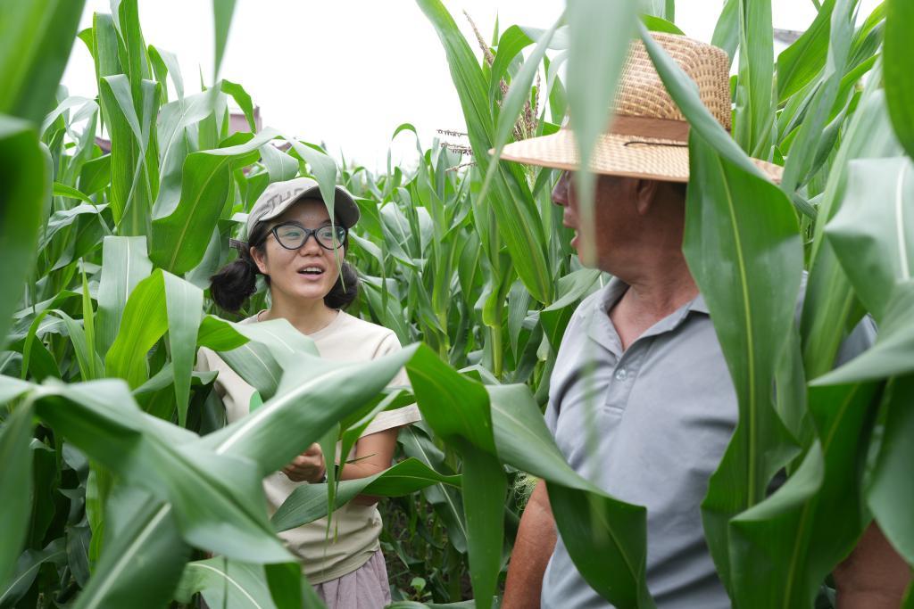 2025年7月17日,在浙江省臺州市椒江區(qū)下陳街道橫河陳村,青年創(chuàng)業(yè)者陳艷(左)在她開設的觀光農(nóng)場內和本地農(nóng)民討論莊稼長勢。新華社記者 翁忻旸 攝