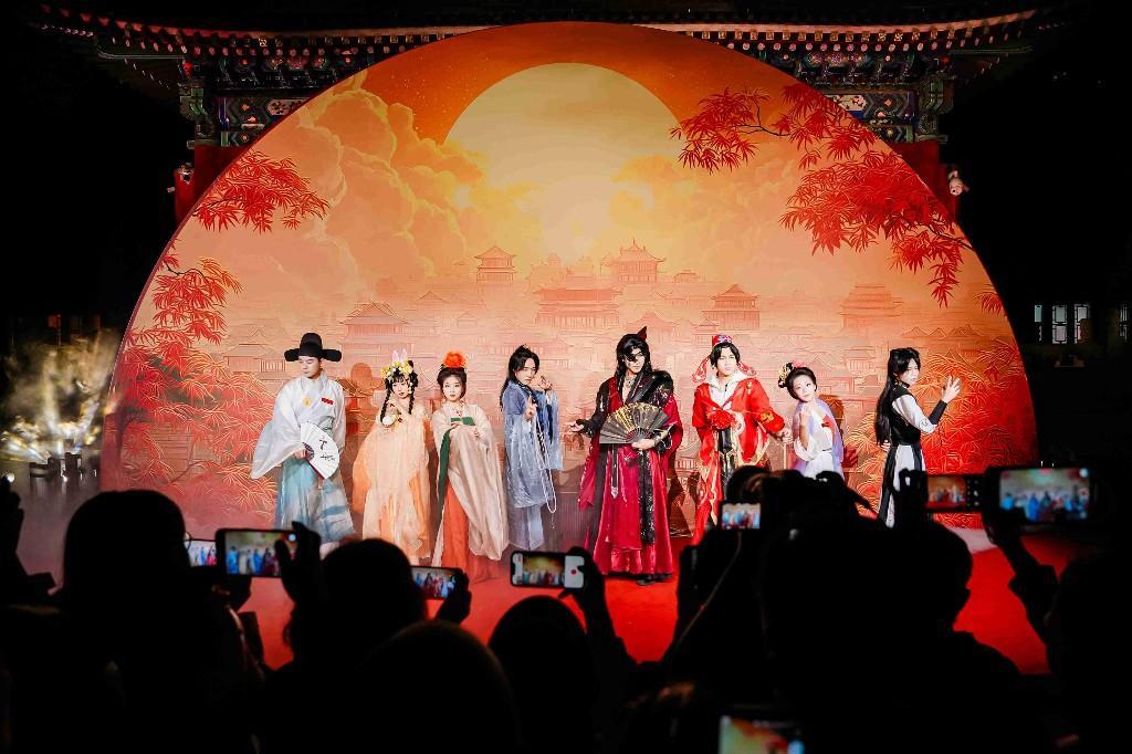 活動(dòng)依托科技化場(chǎng)景營(yíng)造,讓古建煥發(fā)新活力?,F(xiàn)場(chǎng)以朱紅、明黃等傳統(tǒng)色調(diào)為基底,搭配智能暖光系統(tǒng),燈光與空中明月實(shí)時(shí)呼應(yīng),精準(zhǔn)還原“天上月圓、人間夢(mèng)好”的視覺效果;庭院與市集區(qū)域的主題燈飾融入宮廷與中秋意象,通過燈光控制技術(shù)實(shí)現(xiàn)夜幕下“宮闕映月”的動(dòng)態(tài)詩意場(chǎng)景,讓游客仿佛穿越千年。
