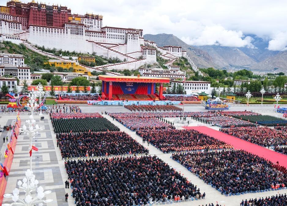 8月21日上午,西藏各族各界干部群眾約2萬人歡聚拉薩市布達(dá)拉宮廣場,熱烈慶祝西藏自治區(qū)成立60周年。這是慶祝大會(huì)現(xiàn)場。