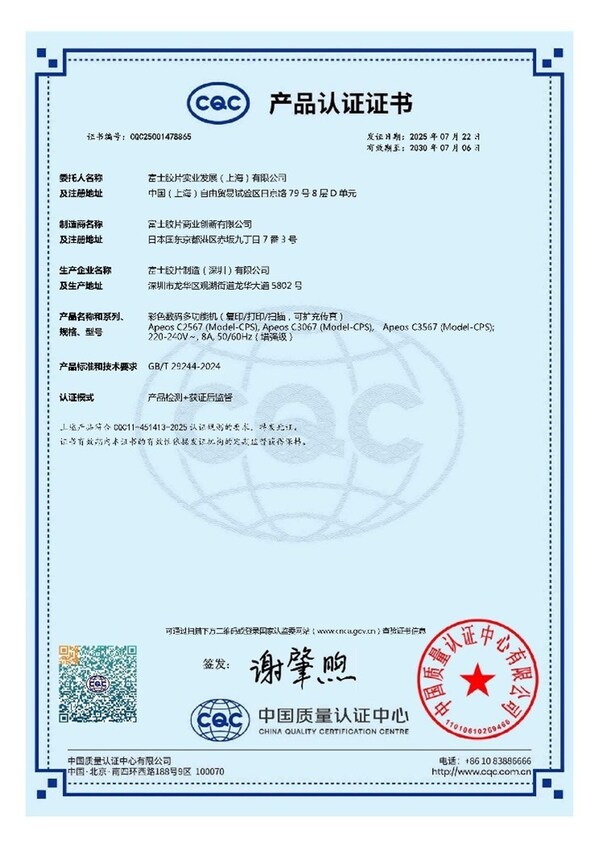 近日,富士膠片智能型A3彩色數(shù)碼多功能機Apeos C3567/C3067/C2567獲中國質量認證中心(CQC)頒發(fā)的“辦公設備網絡安全認證”,系列產品是首批達到新版國家標準GB/T 29244-2024《網絡安全技術 辦公設備安全規(guī)范》(增強級)的產品之一。作為首批獲該認證的企業(yè),富士膠片商業(yè)創(chuàng)新(中國)有限公司在積極推進全行業(yè)加速數(shù)字化轉型的同時,通過提供具有全方位安全防護的智能型數(shù)碼多功能設備和網絡安全網格解決方案與服務為企業(yè)構筑全面的信息安全防護。