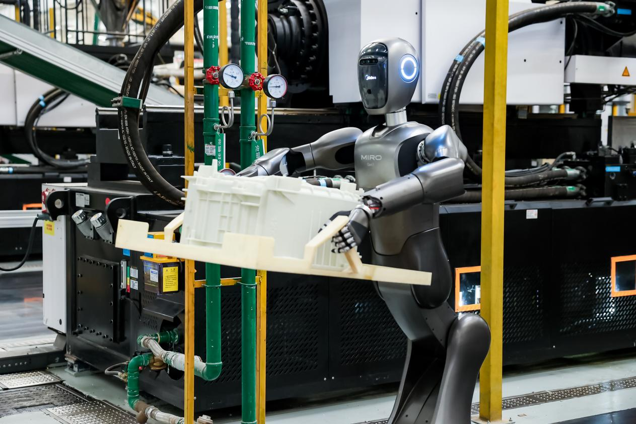 除了智能體工廠的探索,美的集團依托自有制造工廠與產線,實現人形機器人從實驗室到現場應用的跨越。在注塑車間,人形機器人完成階段性調試,并與工廠業(yè)務系統(tǒng)打通,形成業(yè)務閉環(huán)。