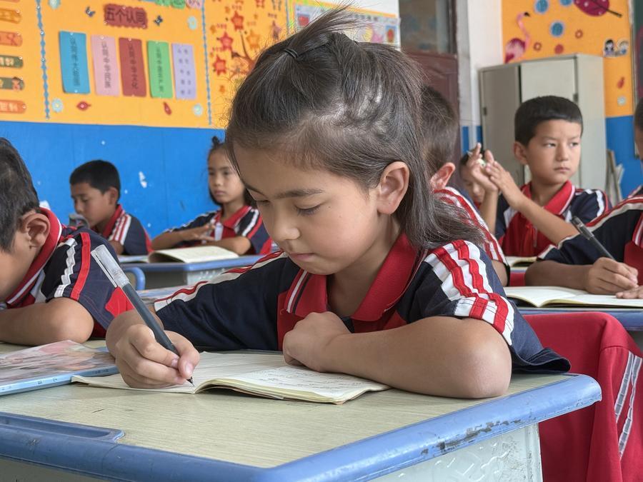 9月17日,鄯善縣達(dá)朗坎鄉(xiāng)中心學(xué)校三年級(jí)四班學(xué)生乃則熱與同學(xué)們上數(shù)學(xué)課。(受訪者供圖)