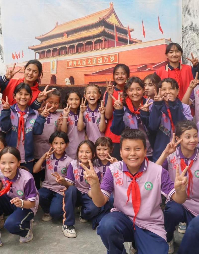 和田縣的小學(xué)生們?cè)谔彀查T背景布前合影。(受訪者供圖)