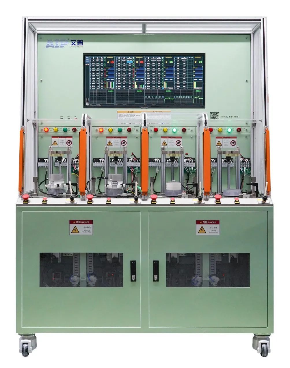 針對這一需求,艾普智能組建專業(yè)團(tuán)隊(duì),經(jīng)深入技術(shù)論證后,定制開發(fā)了一套四工位并行測試系統(tǒng)。該系統(tǒng)采用四工位同步測試設(shè)計(jì),能夠?qū)崿F(xiàn)高效并行測試,可一次性完成負(fù)載測試、霍爾特性、反電動勢、轉(zhuǎn)速、轉(zhuǎn)向、缺相、交流耐壓、絕緣電阻等多項(xiàng)測試項(xiàng)目,大幅提升測試效率?;谀K化設(shè)計(jì),一套設(shè)備即可滿足直流電機(jī)與交流電機(jī)的測試需求,顯著降低客戶設(shè)備采購與管理成本。此外,智能化管理方面,該設(shè)備支持與工廠MES系統(tǒng)對接,具備遠(yuǎn)程診斷和軟件升級功能,可實(shí)現(xiàn)測試數(shù)據(jù)的實(shí)時上傳與分析,快速響應(yīng)客戶需求。