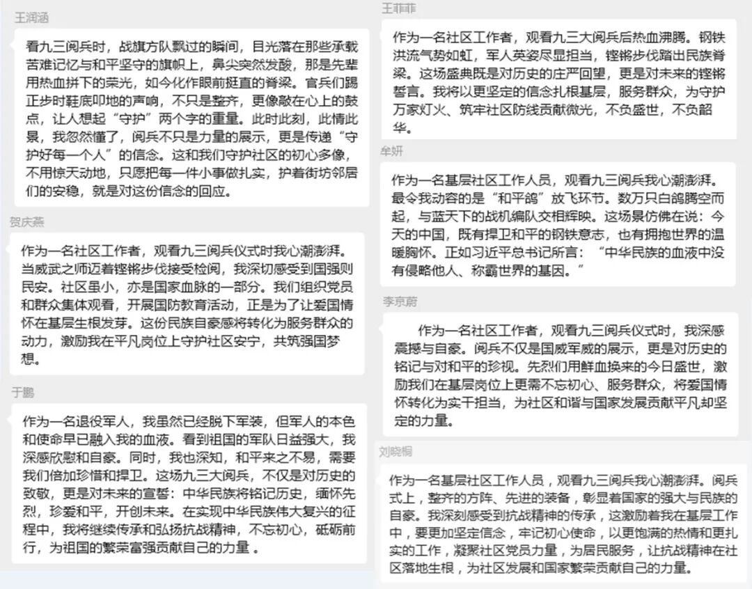 觀看結(jié)束,社區(qū)黨組織還特別設(shè)置了“初心分享”環(huán)節(jié)。黨員和群眾結(jié)合自身經(jīng)歷,暢談對(duì)歷史的理解、對(duì)當(dāng)下的感悟。“作為一名基層社區(qū)工作人員,我將繼續(xù)思為民服務(wù)之責(zé)、添干事創(chuàng)業(yè)之勁。今后,海越社區(qū)將把今天激發(fā)的澎湃熱情,轉(zhuǎn)化為扎根社區(qū)、服務(wù)居民的實(shí)際行動(dòng),以更加飽滿的熱情、更加務(wù)實(shí)的作風(fēng),投身到社區(qū)工作中,為筑牢黨的執(zhí)政根基、構(gòu)建和諧美好社區(qū)、實(shí)現(xiàn)中華民族偉大復(fù)興的中國(guó)夢(mèng)貢獻(xiàn)堅(jiān)定力量!”社區(qū)黨總支書記的發(fā)言引發(fā)共鳴。大家紛紛表示,要把閱兵式中感受到的愛國(guó)熱情和民族精神,轉(zhuǎn)化為服務(wù)群眾的實(shí)際行動(dòng),在化解鄰里矛盾、推進(jìn)基層治理、開展志愿服務(wù)中踐行使命。