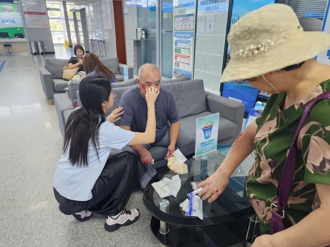 “請問,這附近有衛(wèi)生所嗎?”近日,煙臺高新區(qū)政務(wù)服務(wù)中心迎來兩位老人,走在前面的大姨向服務(wù)臺工作人員詢問道。經(jīng)了解,75歲的王阿姨與老伴在騎電動車前往銀行途中不慎摔倒,導(dǎo)致身體多處擦傷,額頭出血。正在附近引導(dǎo)的志愿者毛曉萱迅速取出醫(yī)藥箱,一邊輕聲安撫老人,一邊仔細(xì)檢查傷勢。她蹲下身,用碘伏為老人清理傷口、貼上敷貼,并耐心詢問身體反應(yīng)。