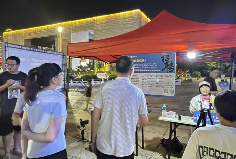 活動打破時空限制,創(chuàng)新采用“線下夜市+線上直播”融合模式。撫州市融媒體抖音號、撫州市就業(yè)之家及撫州高新區(qū)就業(yè)之家抖音號、比亞迪官方直招抖音號等多平臺同步直播,通過鏡頭帶領(lǐng)線上觀眾“云逛展”,實時傳遞現(xiàn)場實況、解讀政策福利、介紹崗位信息,并開通線上簡歷投遞通道。據(jù)統(tǒng)計,直播累計吸引觀看人數(shù)數(shù)萬,互動超3000條,次日即促成600余人正式入職,招聘效率顯著提升。