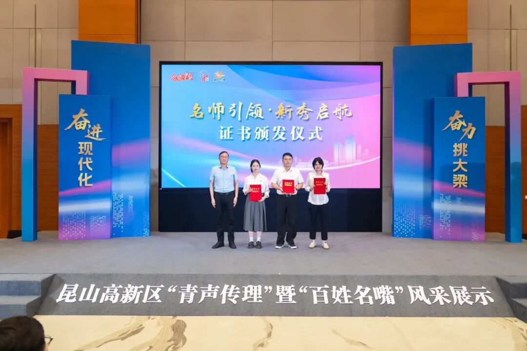 為推動理論宣講更有溫度、更接地氣,引導(dǎo)青年走進一線、服務(wù)群眾,現(xiàn)場還舉行“名師引領(lǐng)·新秀啟航”證書頒發(fā)儀式,蘇州市新時代基層理論宣講名師、昆山市委黨校副校長、蘇州市新時代基層理論宣講名師工作站(昆山高新區(qū)分站)指導(dǎo)老師為青年宣講員代表蔡婧宜、紀斐凡、沈新瑜授證,標志著“新”中有理學(xué)習(xí)品牌在青年群體中開啟新的傳承,讓理論火種在代際接力中持續(xù)點亮基層實踐。