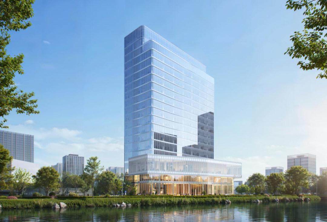 該項目主體塔樓沿江南大道橫向延展,通體采用簡約現(xiàn)代的玻璃幕墻與精密金屬構(gòu)架,形成富有科技感和未來感的城市形象界面。裙房沿場地向南側(cè)拓展,巧妙借景永久河自然風光,內(nèi)部設(shè)置試驗平臺、企業(yè)展廳等功能空間,進一步增強大樓休閑氛圍與社交活力。