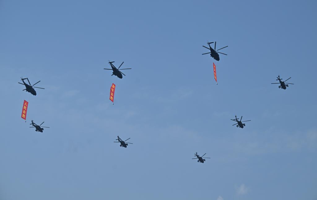 3架直-8L運輸直升機,則分別懸掛“正義必勝”“和平必勝”“人民必勝”標語,與7架直-20T直升機組成三角隊形依次通場。