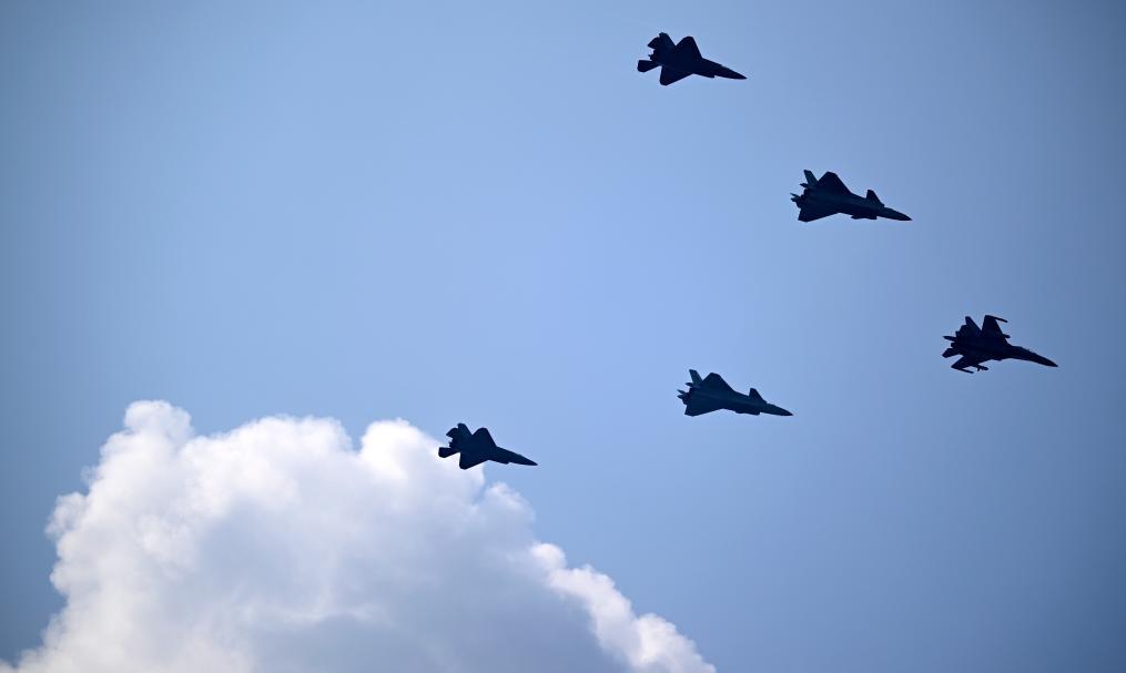 殲-15DH、殲-15DT、殲-35和殲-15T四型10架艦載機,則編成兩個楔隊亮劍云端,呼嘯而過。