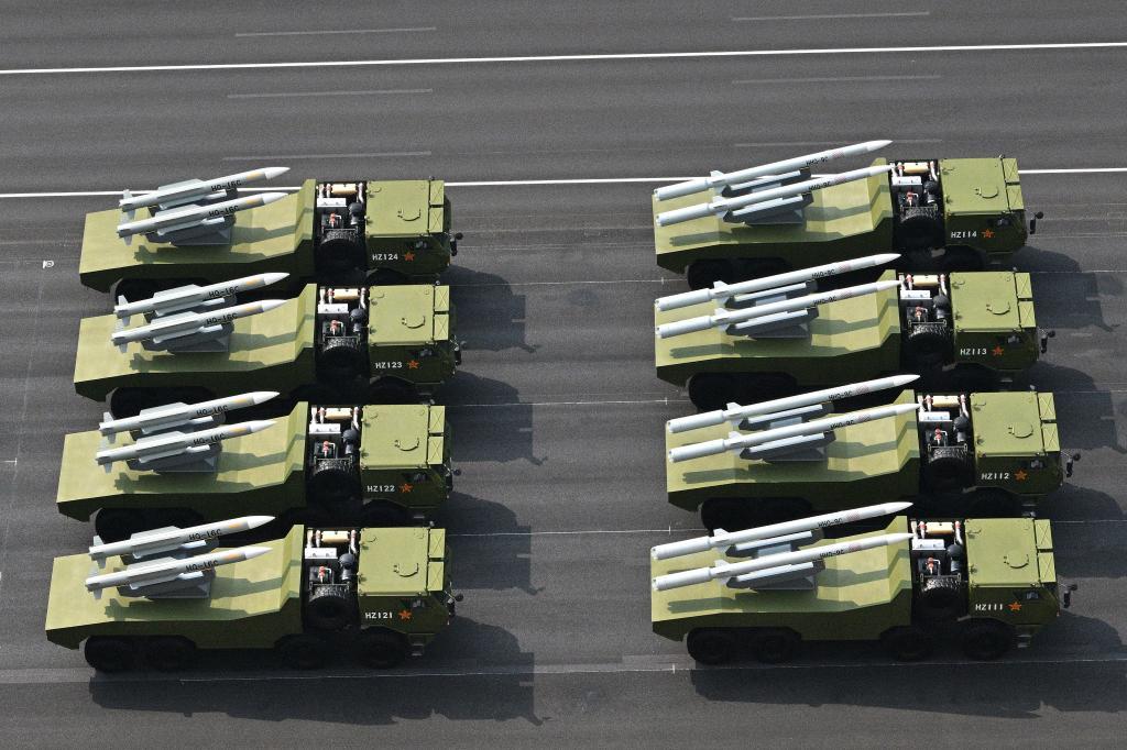 9月3日,紀(jì)念中國(guó)人民抗日戰(zhàn)爭(zhēng)暨世界反法西斯戰(zhàn)爭(zhēng)勝利80周年大會(huì)在北京隆重舉行。這是艦載防空武器方隊(duì)接受檢閱。新華社記者 胡智軒 攝