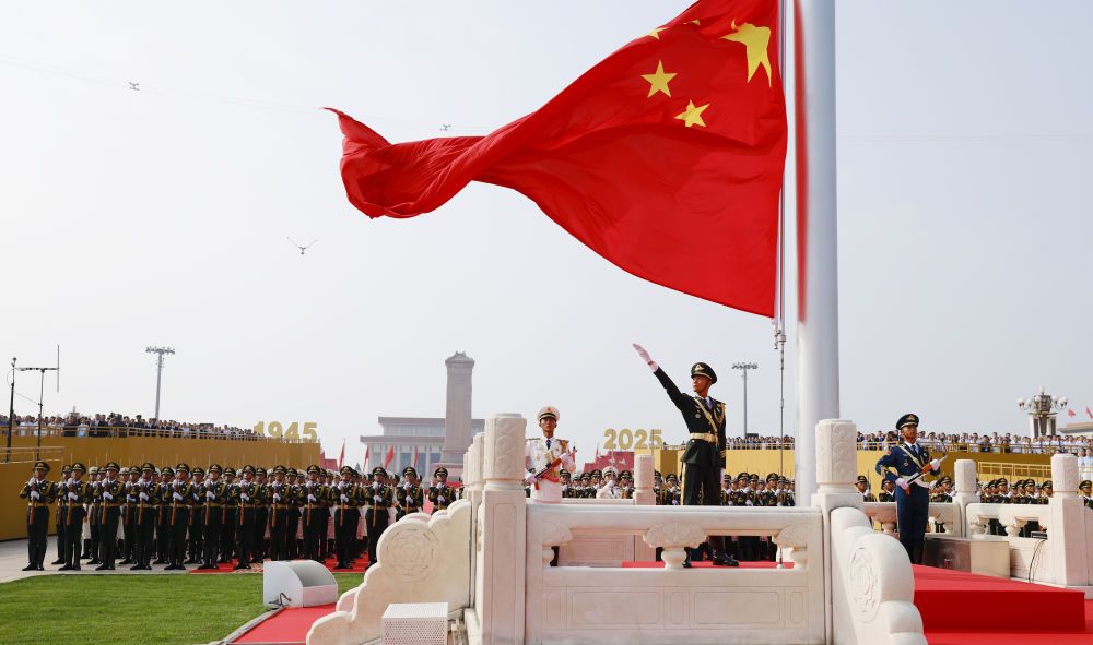 2025年9月3日,紀(jì)念中國人民抗日戰(zhàn)爭暨世界反法西斯戰(zhàn)爭勝利80周年大會在北京隆重舉行。這是天安門廣場舉行隆重的升國旗儀式。新華社記者 費(fèi)茂華 攝