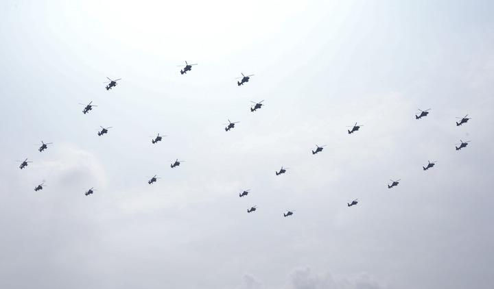 9月3日,紀(jì)念中國(guó)人民抗日戰(zhàn)爭(zhēng)暨世界反法西斯戰(zhàn)爭(zhēng)勝利80周年大會(huì)在北京隆重舉行。這是空中護(hù)旗梯隊(duì)通過(guò)天安門(mén)廣場(chǎng),26架直-19武裝直升機(jī)組成“80”字樣。新華社記者 陳曄華 攝